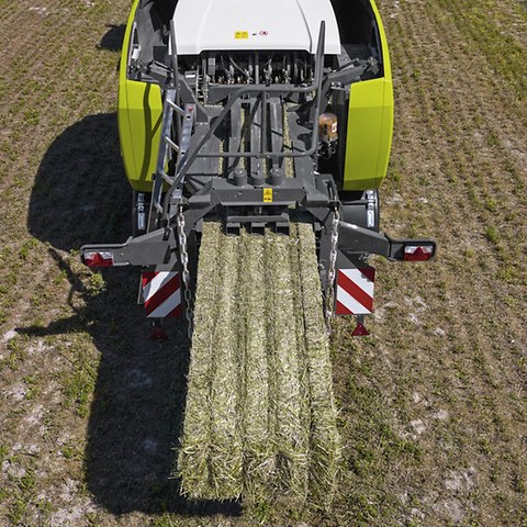 Ciśnienie prasowania można zawsze łatwo i szybko dopasować do warunków pracy za pośrednictwem pulpitu obsługowego. Optymalnie umieszczone koło gwiazdowe dokładnie nadzoruje ustawioną długość balotów – w zakresie od 0,70 do 2,40 m. Kompaktowe, zwarte, prostokątne baloty opuszczają kanał prasowania i są układane na polu przez ześlizg rolkowy.