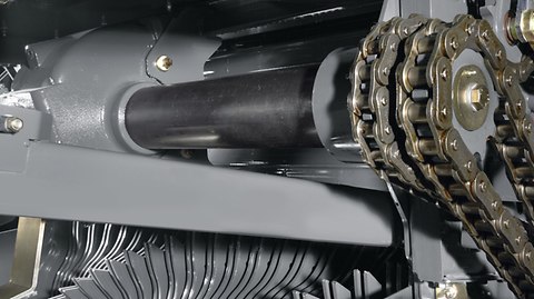 Seria 400 ma zwiększony o 30% moment obrotowy na przekładni głównej. Rezultat: jeszcze większa wydajność, która jest istotna w przypadku ciężkiego materiału, jakim jest wilgotna lub mokra kiszonka. A propos Heavy Duty: masywny rotor jest wykonany z podwójnie utwardzanej stali borowej o grubości 8,00. Cztery rzędy zębów zapewniają optymalne przyswajanie paszy. Nakład sił jest stosunkowo niewielki dzięki spiralnemu ułożeniu podwójnych zębów. Wszystko jest chronione solidną ramą. Wzmocnione walce posiadają duże czopy osi. Osiem zespawanych z płaszczem walca wzmocnień zapewnia maksymalną stabilność.Wszystkie komponenty Heavy Duty powstały z myślą o długiej, ciężkiej pracy – niezależnie od tego, ile dni prasa ROLLANT będzie pracować. Można to również poznać po dużych wymiarach łańcuchów:- Łańcuchy rotora Heavy Duty marki Tsubaki- Łańcuch napędu głównego Heavy Duty- Łańcuch pokrywy tylnej Heavy Duty