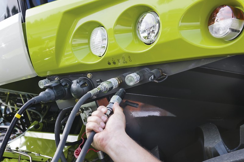 Przy dojechaniu do przyrządów roboczych i przy dołączaniu do JAGUAR serii 800 lub 900 układ napędu będzie automatycznie łączony przez szybkozłącza. Centralne ryglowanie jest łatwo dostępne i pewnie łączy przyrząd roboczy z sieczkarnią. Funkcje przyrządu roboczego są czysto podłączone przez dwa uszczelniane powierzchniowo złącza hydrauliczne i kabel sterujący.