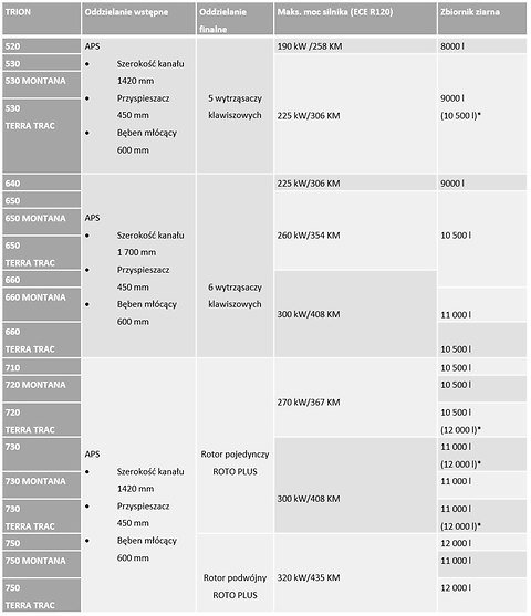 Gama maszyn TRION zasadniczo dzieli się na trzy serie z kombajnami wytrząsaczowymi i kombajnami hybrydowymi oraz z dwiema szerokościami kanału omłotowego: