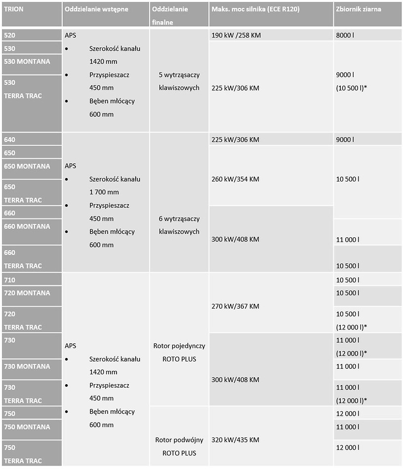 - TRION 700 z systemem omłotu APS HYBRID (TRION 710 – 730 z rotorem pojedynczym ROTO PLUS, TRION 750 z rotorem podwójnym ROTO PLUS), szerokość kanału 1420 mm